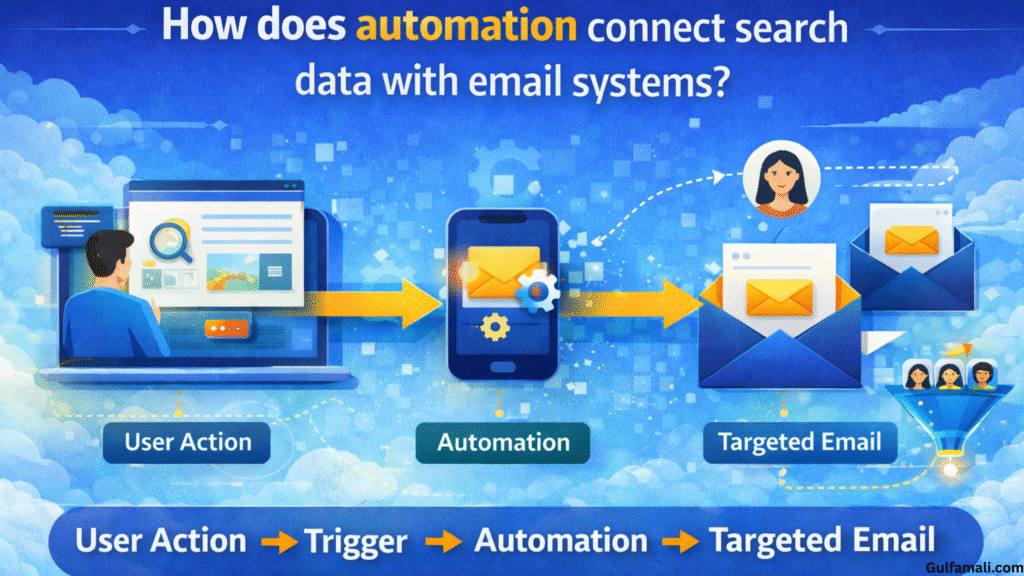 Users who engage with certain topics can receive related follow-up emails. This connects search behavior directly to communication.