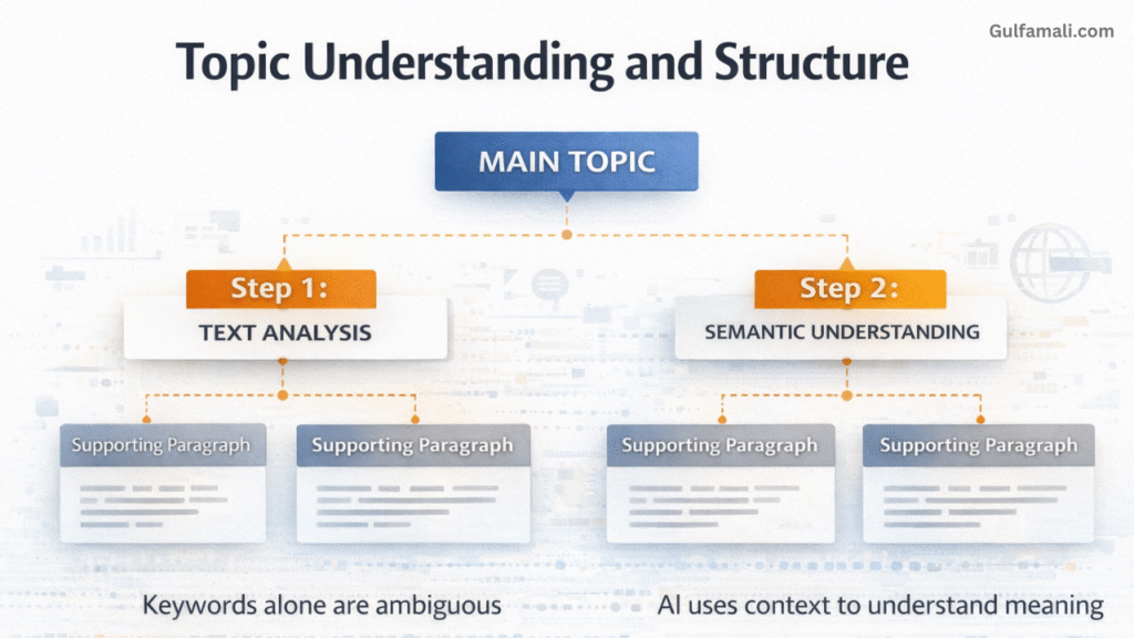 AI studies nearby sentences to understand intent. This helps it decide whether content is explanatory, instructional, or informational.